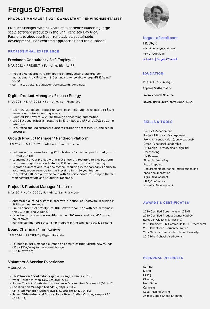 Resume Resume / CV Jul 29, 2022 1 min read Available for download upon request: ofarrell.fergus@gmail.com. More information is on LinedIn: Linked In | Fergus O'Farrell